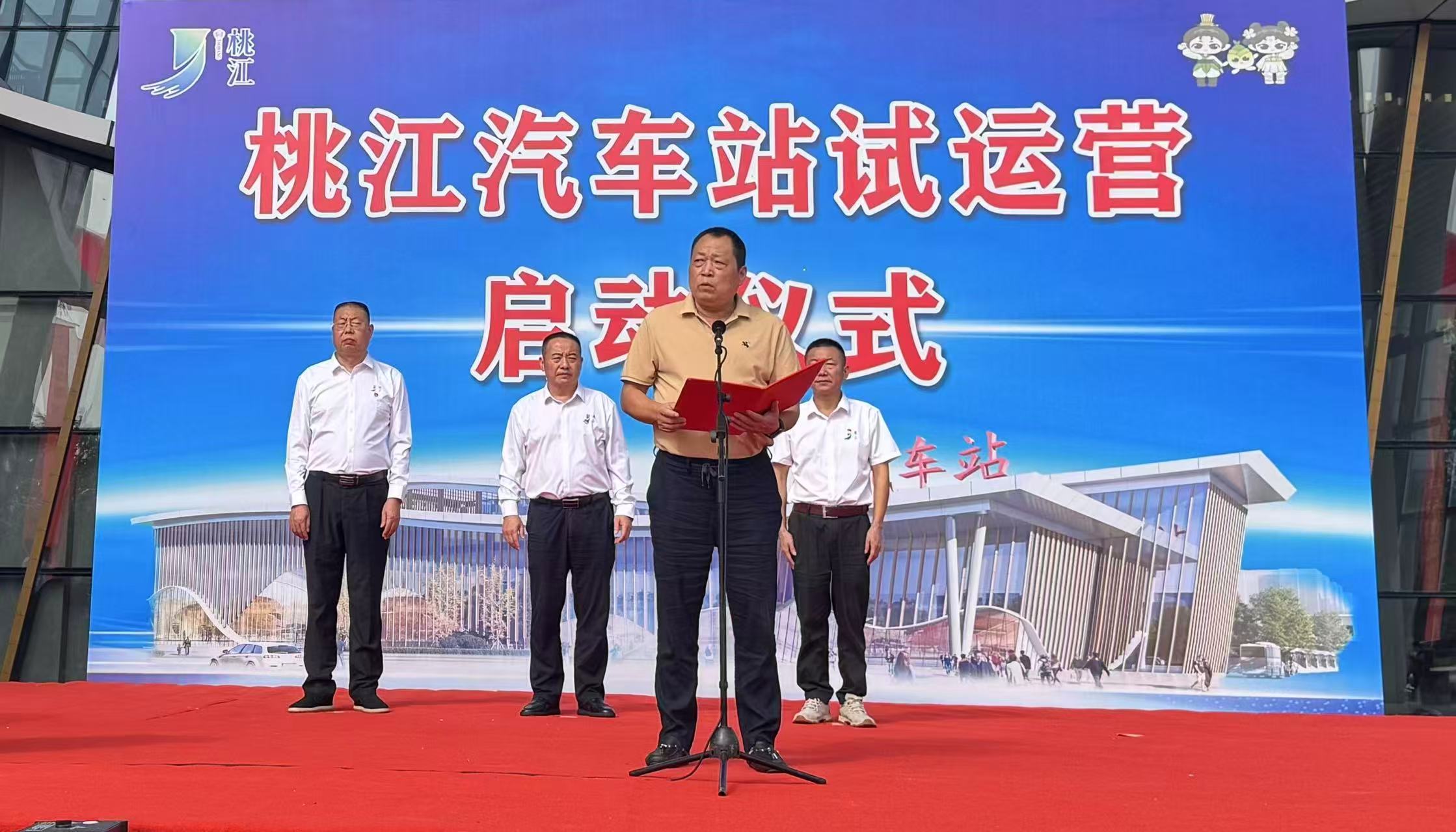 啟動(dòng)儀式由桃江縣政府辦黨組成員、副主任曾小平主持;縣交通運(yùn)輸局黨組書(shū)記、局長(zhǎng)胡鶴鳴和益陽(yáng)湘運(yùn)集團(tuán)股份有限公司董事長(zhǎng)郭躍明分別致辭;桃江縣委常委、常務(wù)副縣長(zhǎng)熊躍明宣布該站正式啟動(dòng),并與郭躍明一起為車(chē)站揭牌。