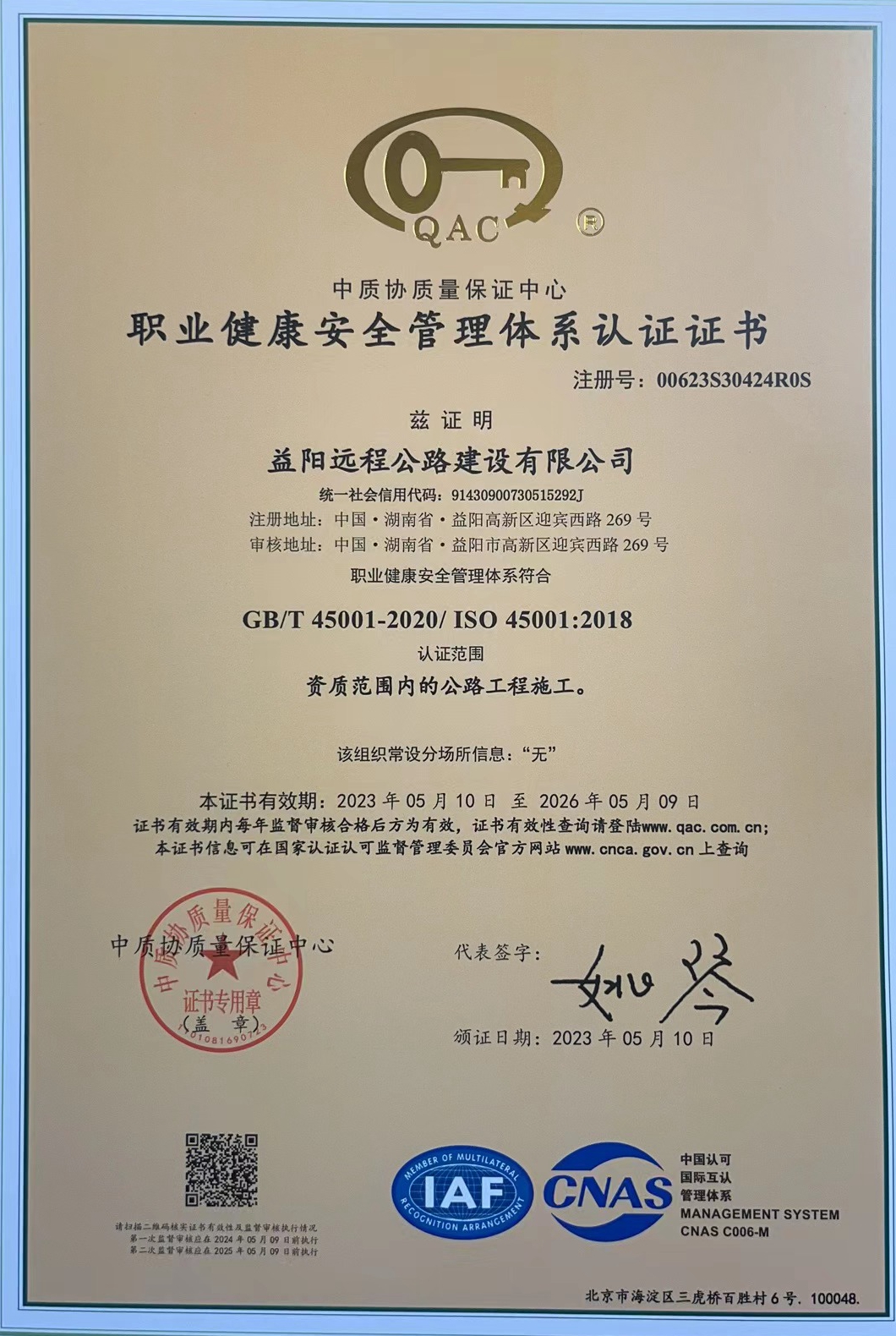 5月10日,中質(zhì)協(xié)質(zhì)量保證中心授予益陽遠(yuǎn)程公路建設(shè)有限公司質(zhì)量管理體系、職業(yè)健康安全管理體系和環(huán)境管理體系認(rèn)證證書。(盛 鶯)