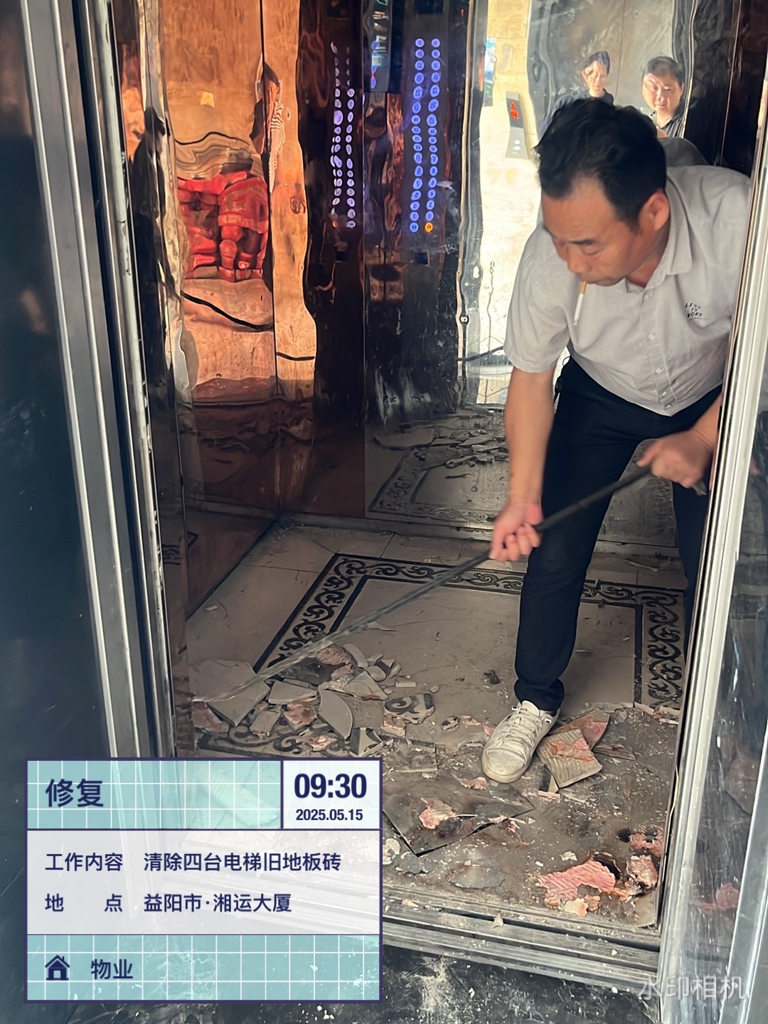 為優(yōu)化湘運(yùn)大廈公共設(shè)施,提升用戶出行安全性與舒適度。5月15日,湖南遠(yuǎn)程建設(shè)集團(tuán)有限公司物業(yè)部按經(jīng)理周琦順要求,對(duì)大廈內(nèi)電梯設(shè)施啟動(dòng)專(zhuān)項(xiàng)改造工程,對(duì)三臺(tái)客梯及一臺(tái)貨梯的陳舊底板進(jìn)行全面更換。改造前,在副經(jīng)理潘宇文與新裝酒店施工方商討對(duì)接后,確定由公司物業(yè)工程人員完成舊底板的拆除清理,由酒店方鋪設(shè)全新耐磨地板的方案,同時(shí)創(chuàng)新采用"半覆蓋木板"防護(hù)措施,有效降低裝修材料運(yùn)輸對(duì)地面的磨損。針對(duì)實(shí)施過(guò)程中樓內(nèi)裝修施工頻繁的情況,辦公室還特別強(qiáng)調(diào)在每部電梯新增半塊可拆卸木板,既保護(hù)新底板免受建材刮擦,又不影響日常使用便利性。(郭燦燦)